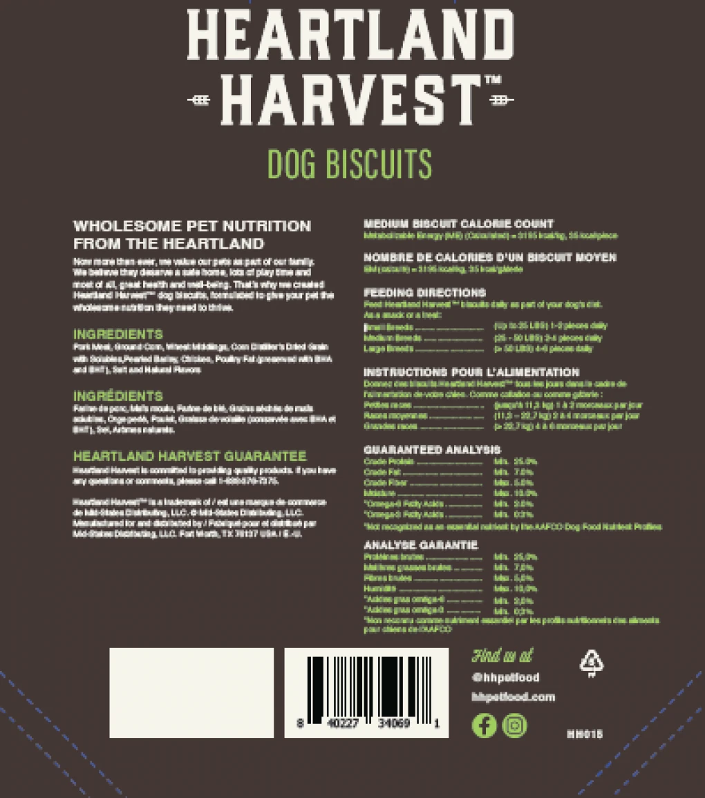 - Heartland Harvest Dog Biscuits – Meaty Flavor with Chicken, 4 lb. bag (UPC 840227340691, Lot Code: 40906513, Best By 09/06/2026)