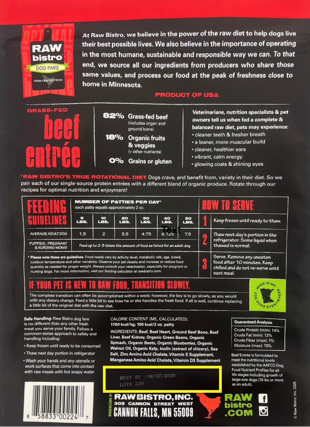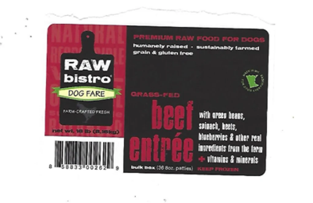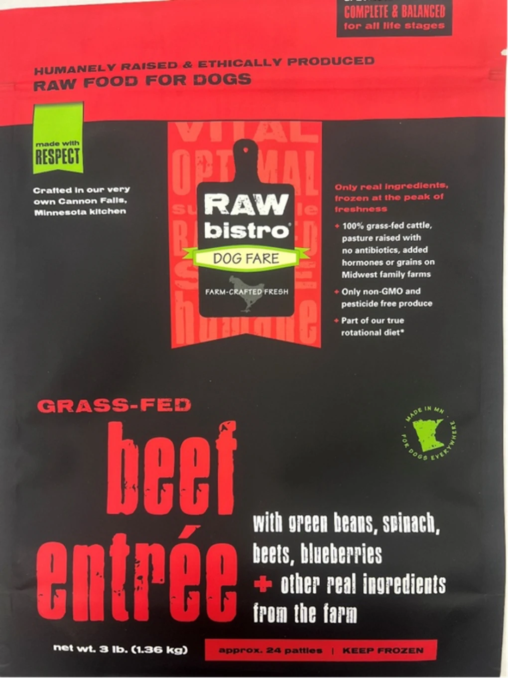 - Raw Bistro Dog Fare Grass-Fed Beef Entrée, Frozen – 3 lb bags (UPC 858833002247)