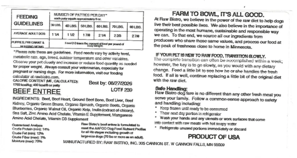 Raw Bistro Pet Fare, a pet food company based in Cannon Falls, Minnesota, is voluntarily recalling two products of its frozen beef dog food due to possible contamination with Salmonella. The recall affects the following products, both with a “Best By” date of August 27, 2026, and lot number 239:
